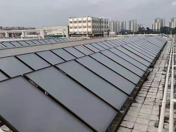 太陽能水箱安裝案例展示,大麵積的太陽能晶板組裝成型的太陽能係統,,匹配方形不鏽鋼保溫水箱;