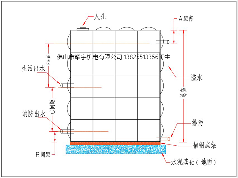 以上圖為例,不鏽鋼方形水箱為長4500mm*寬4000mm*高5000mm,假設設計的不鏽鋼消防水箱所需要的有效容量為36立方,生活用水的有效容量為45立方,那麼“C間距為”的尺寸2米,則消防出水口以下的容量為4.5米*4米*2米=36立方,即滿足消防用水容量。